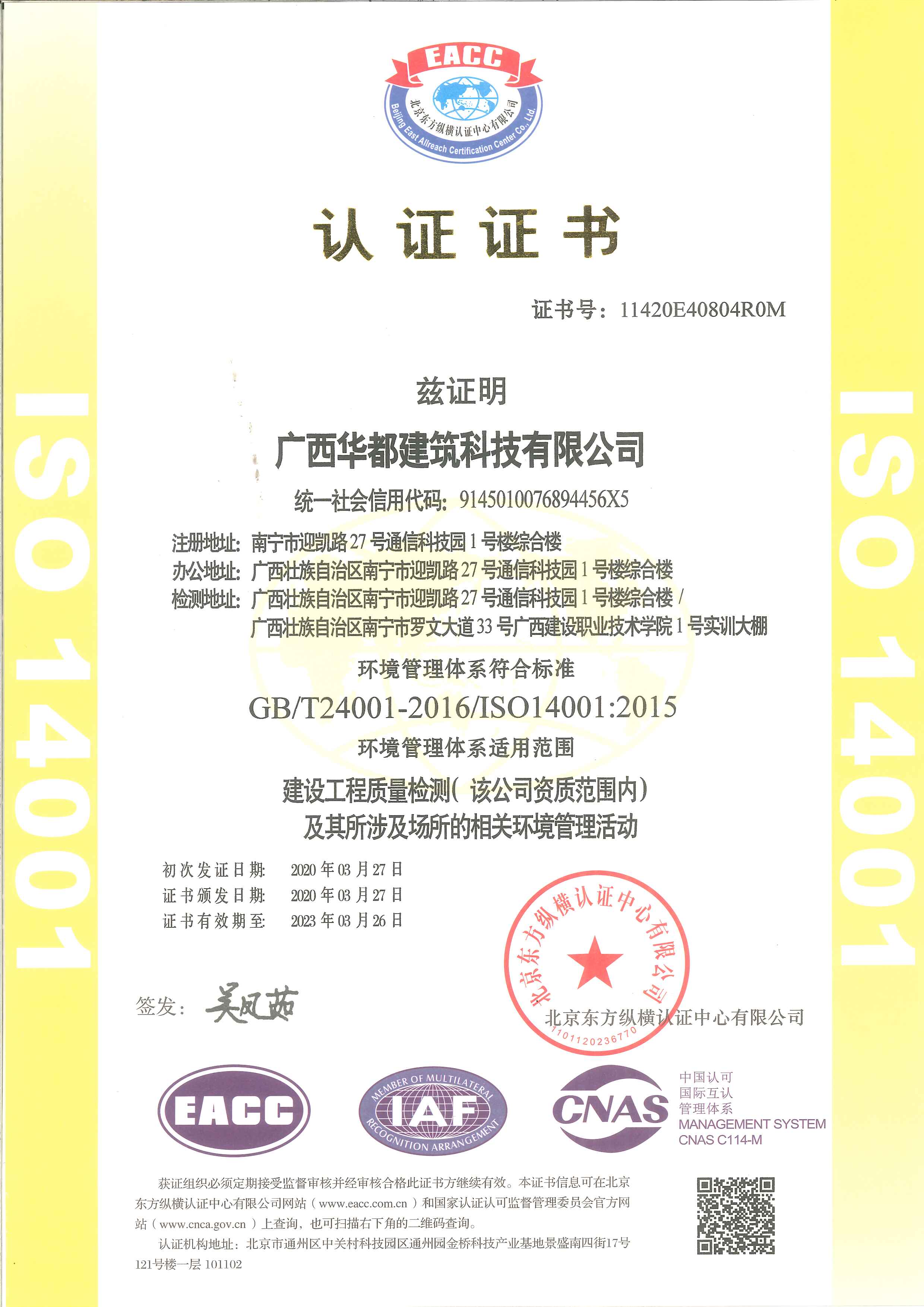 ISO14001認證證書